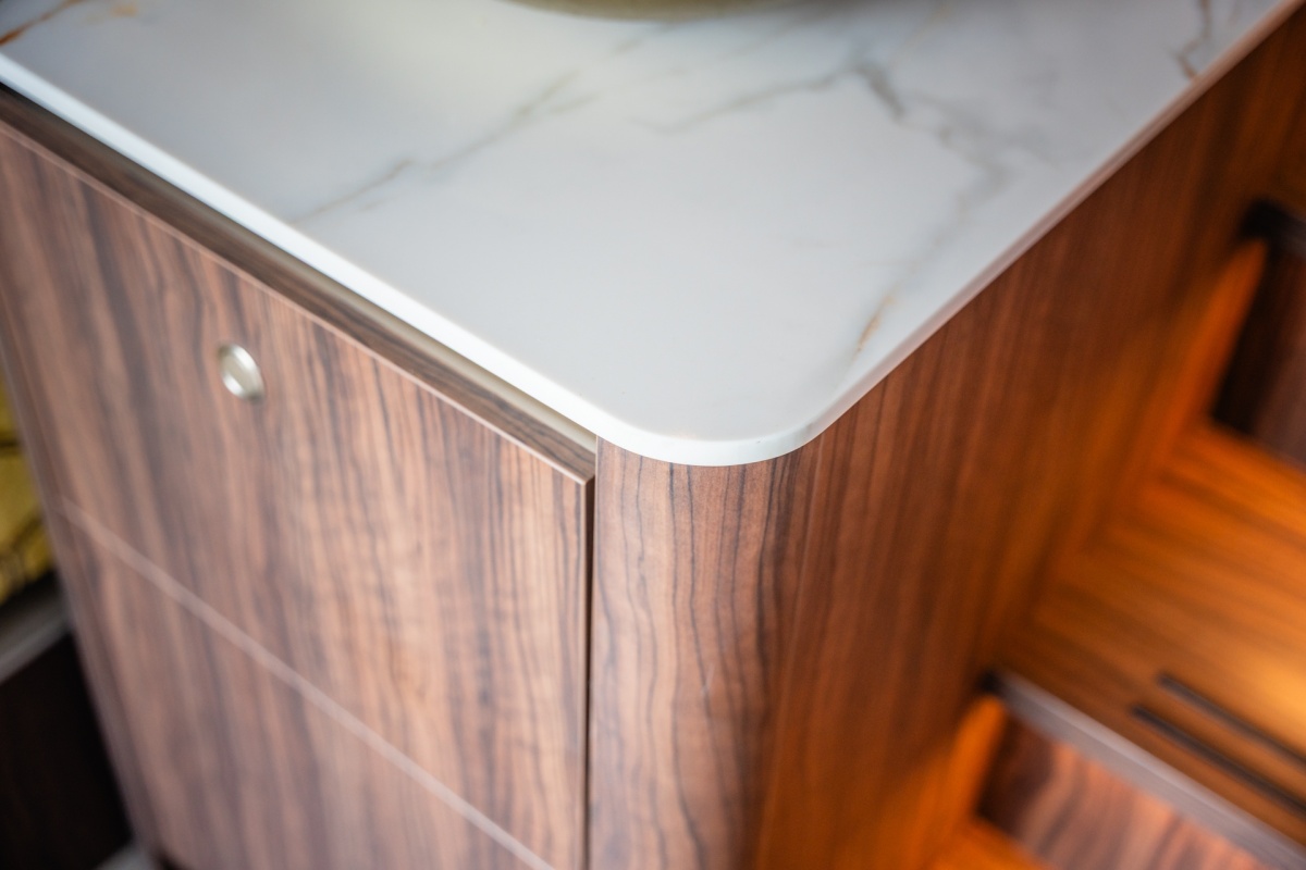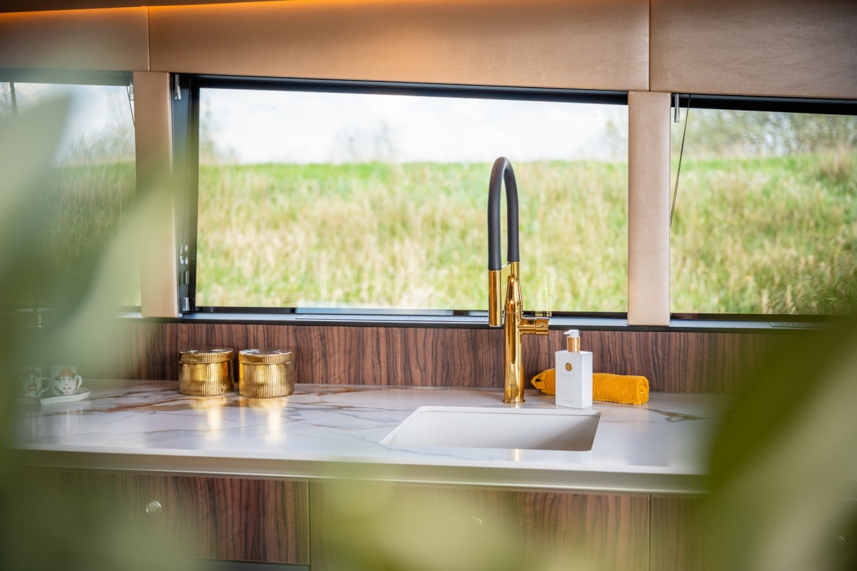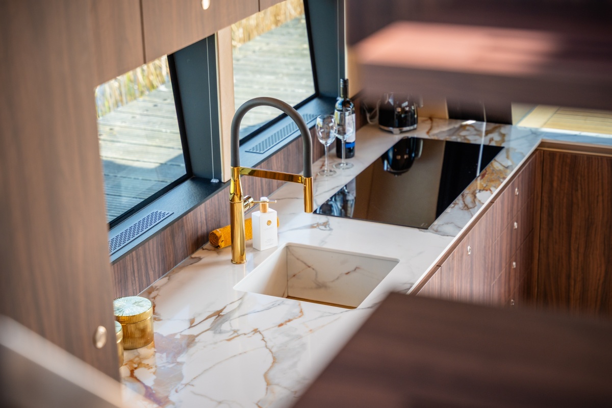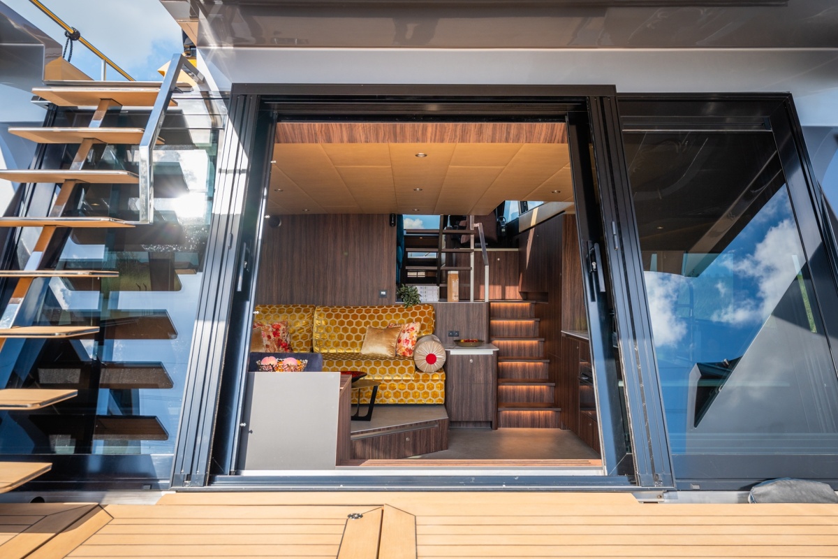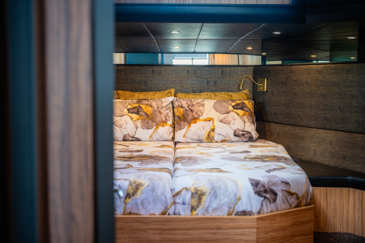 Bemerkenswert ist, dass Sie beim morgendlichen Aufwachen hinaus auf das BeachDeck bis zum Wasser blicken können, sobald Sie die Tür der Eignerkabine öffnen, und zwar dank der vielen Glasflächen. Dadurch fühlt sich die Eignerkabine in jeder Hinsicht wie eine 5-Sterne-Hotelsuite an.