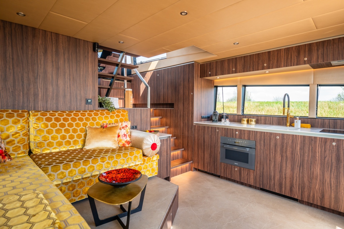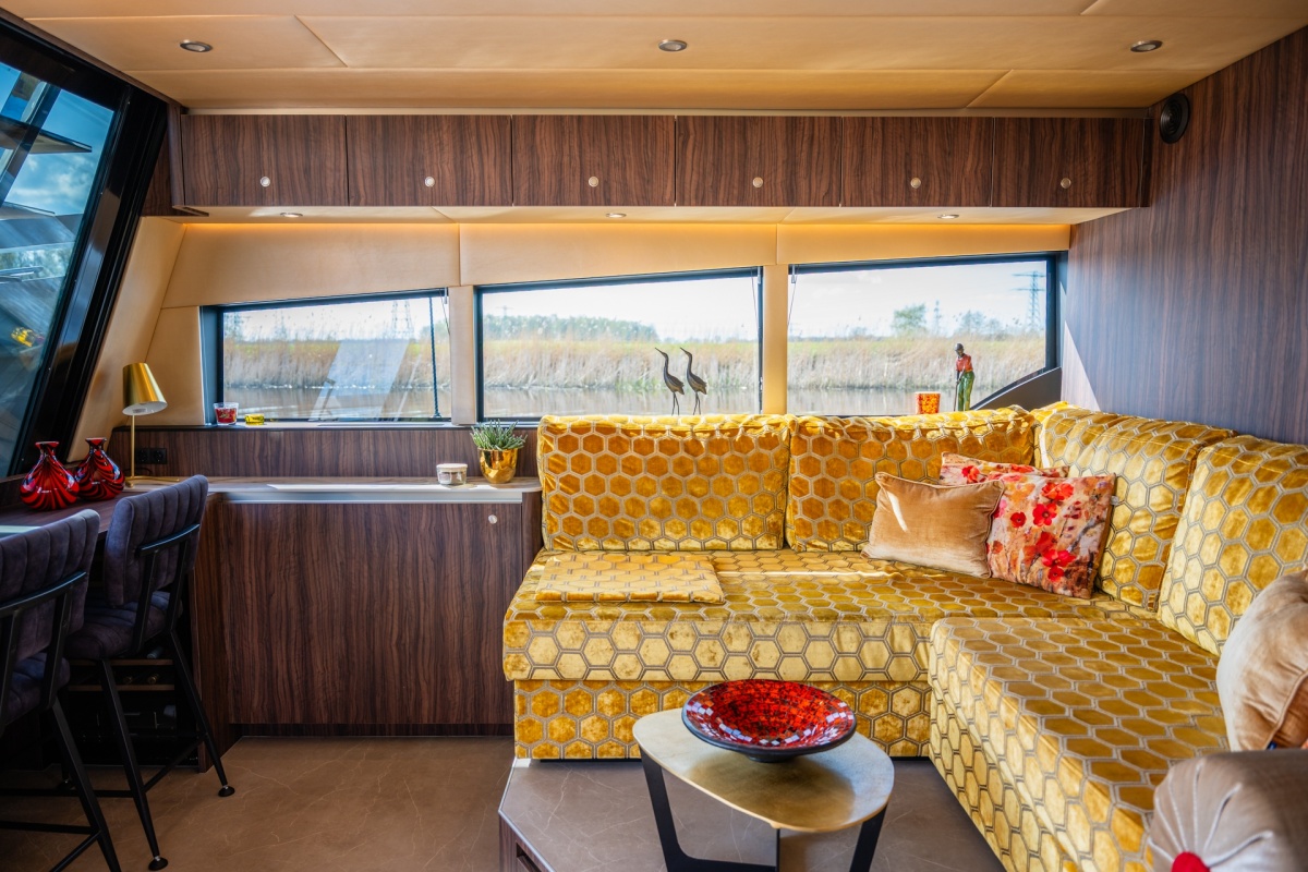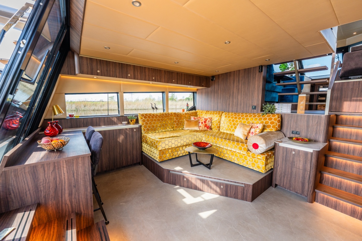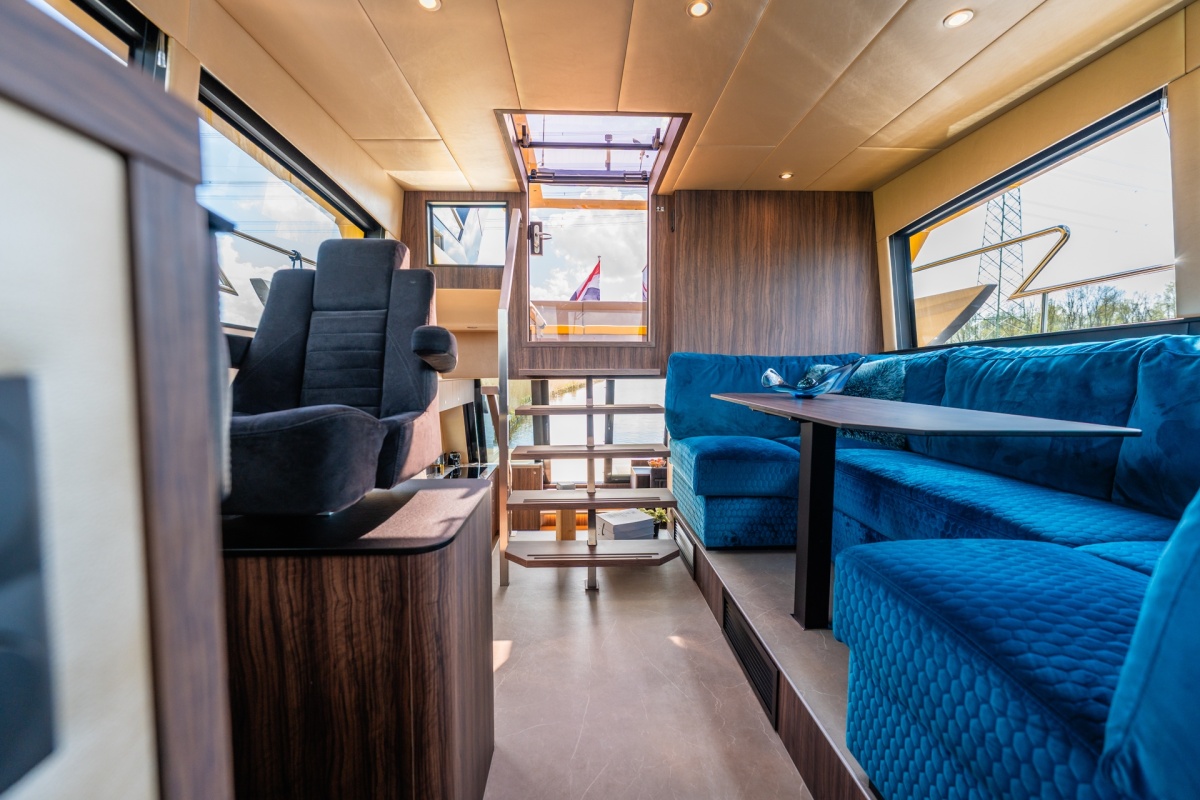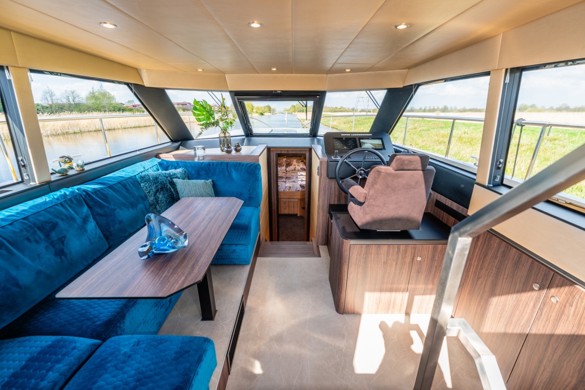 Wie auf dem gesamten Schiff sorgen auch im WheelHouse die großen Fenster für eine fantastische Verbindung zur Außenwelt. Die großzügige U-förmige Bank ist etwas höher angebracht, so dass Sie auch im Sitzen die Aussicht genießen können.