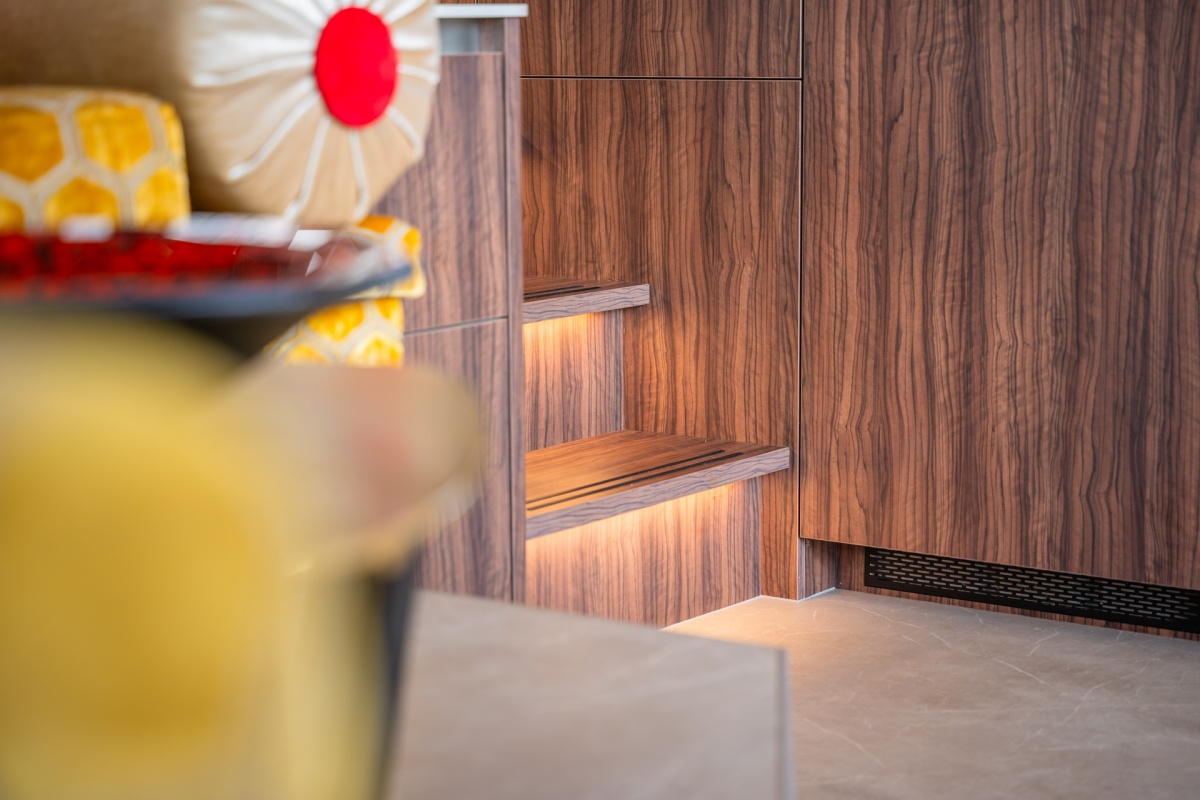 Über fünf Stufen gelangen Sie von der BeachLounge in das obere WheelHouse, den zentralen Raum des SLX54. Von hier aus können Sie auch zum SunDeck und zu den Kabinen im vorderen Teil des Schiffes gelangen.