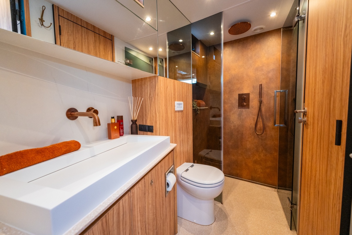 Das eigene Badezimmer ist sowohl vom Flur als auch von der Eignerkabine aus zu betreten. Es ist mit einer Regendusche, einem geräumigen Waschbecken und einer Toilette ausgestattet. Wie es sich für eine Super Lauwersmeer gehört, verfügen alle Räume über zahlreiche Schränke, Schubladen und praktische Stauräume. Die fünfzigjährige Erfahrung im Yachtbau ist in jedem Aspekt zu spüren.