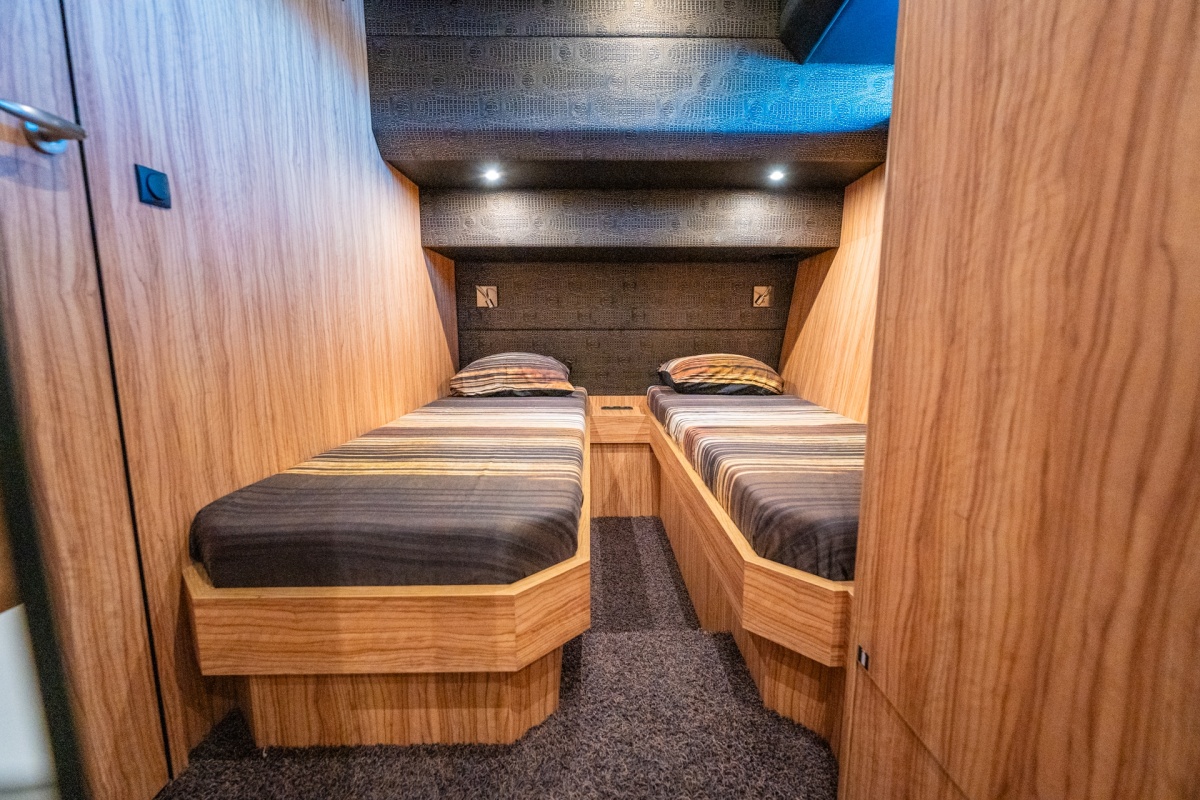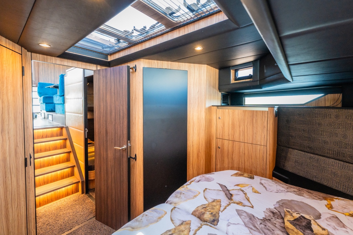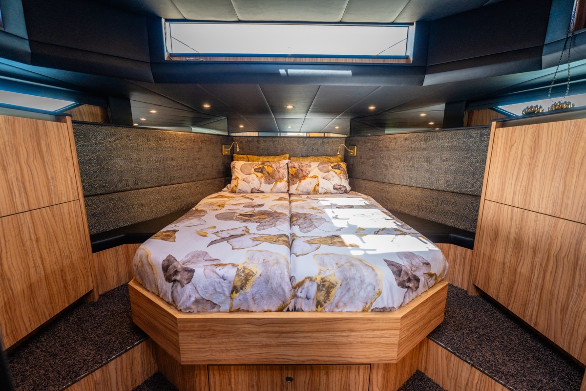 Wenn es Abend wird, betreten Sie die beiden Kabinen im vorderen Teil des Schiffes über den WheelHouse. An Bord der ersten SLX54 gibt es zwei geräumige Kabinen und zwei Badezimmer. Auf der Backbordseite befindet sich eine Doppelkabine mit eigenem Bad, das mit einer eigenen Toilette, einer Regendusche und einem Waschbecken ausgestattet ist.