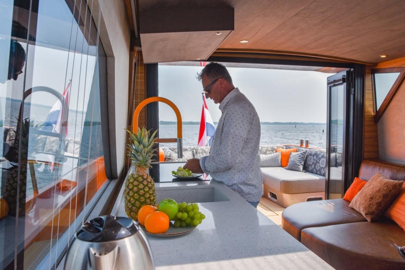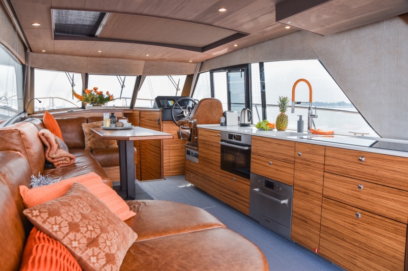 Everything may look impressive below deck, but on the deck you experience the same. The elevated construction turns the salon into a true penthouse. The 10 centimetres of extra height receive an additional dimension thanks to the enormous windows. From the front, sides and behind; you can enjoy a panoramic view from everywhere in the salon. Additionally, when the four doors are open, kitchen and cockpit are completely connected. The lengthened roof, providing extra cover for the cockpit, contributes to this effect just like the enormous openable skylight that even gives you beautiful upwards vistas.
