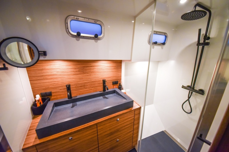 Below deck, the spatial feeling has permeated all quarters, with thanks to the full bow. Compared to other OC-yachts, the extra space allows a different layout. This time we have decided on a shower room on starboard side and a separate toilet on port side. The enormous shower (with glass walls, sink and mirror) and the spacious toilet (with sink) are located on the left and right directly behind the owner’s cabin. No cramped feelings here either, but an immense freedom of movement.