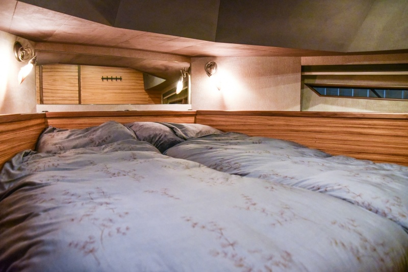 The guest cabin also presents such generous measurements. Two single beds invitingly stand next to one another, and yet there is no lack of walking- or storage space. The unrivalled standing height of the owner’s cabin is also present in the guest cabin. The salon is located above this room, and the dining area of said compartment is positioned on a platform, so one experiences the same standing height in the guest cabin as in the owner’s cabin.