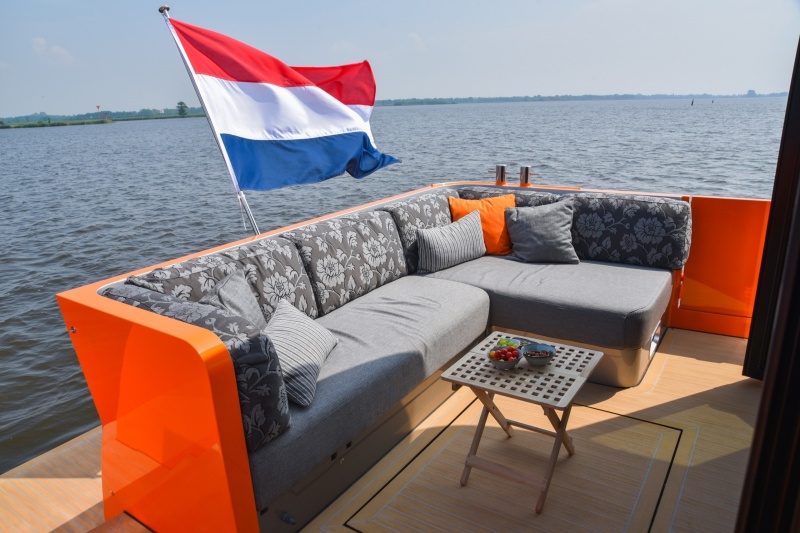 In the ultimate indoor-/outdoor experience, the layout plays a crucial part. The kitchen as well as the luxurious sofas are positioned in the back and thus form a whole with the unique corner lounger in the cockpit. The connection between the two spaces is accentuated further as they have the same floor and because you can watch the television (which is housed in the ceiling) from all relaxation areas. In this manner, Super Lauwersmeer puts the ultimate lounge boat on the market with the Discovery 47 OC.