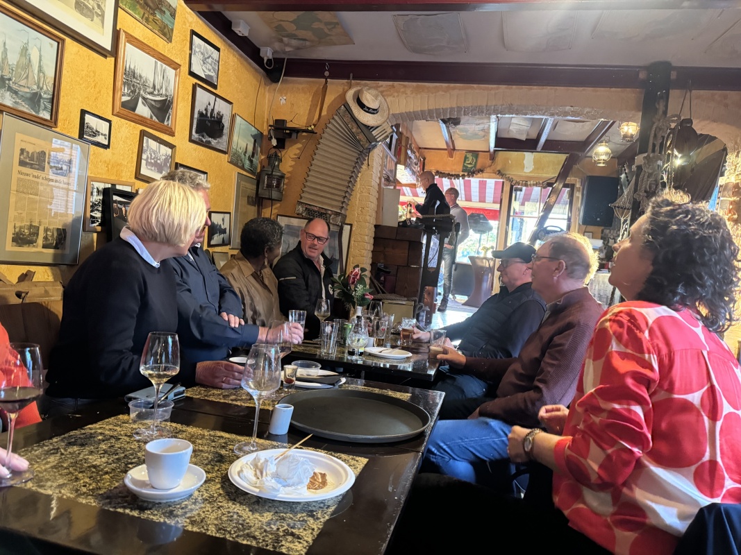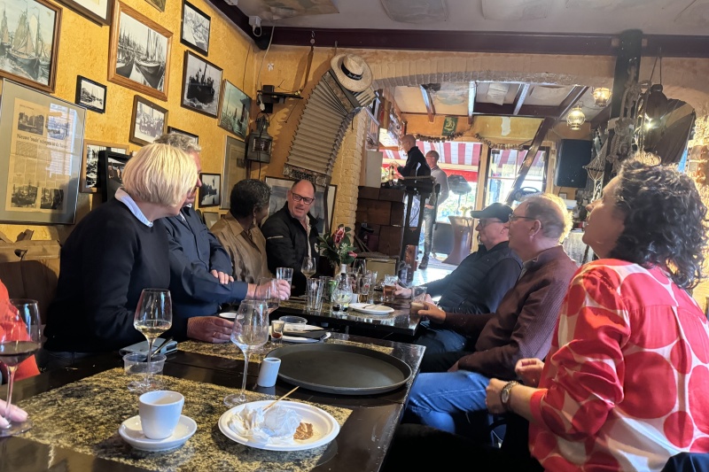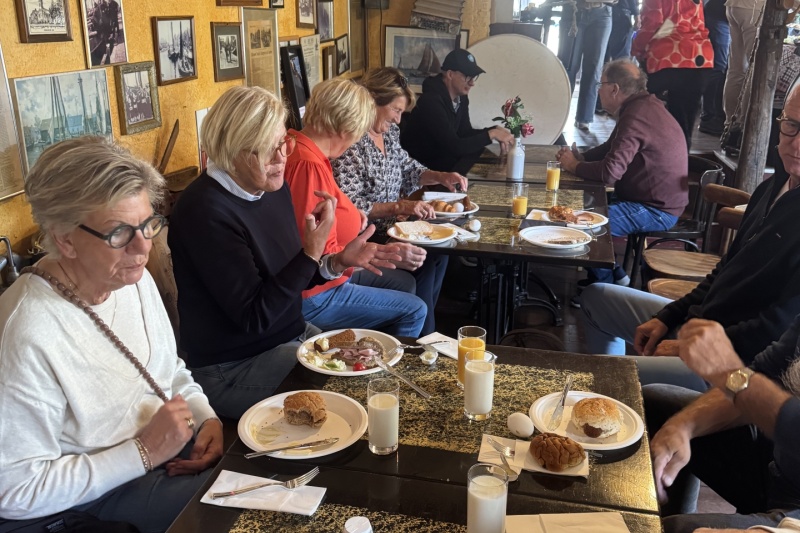 Na het middageten zette het gezelschap koers naar het museum van Spakenburg. “Daar kregen we een rondleiding van een gids over en door de geschiedenis van deze historische vissersplaats. Zo leerden we alles over de Zuiderzee, de schippers en de klederdracht.” Een bezoek aan de visafslag volgde. “Na uitleg over hoe het er op een veiling aan toegaat, kochten we daar heerlijke makreel. Die namen we mee aan boord van twee oude botters, waarmee we onder begeleiding een zeiltocht maakten.”